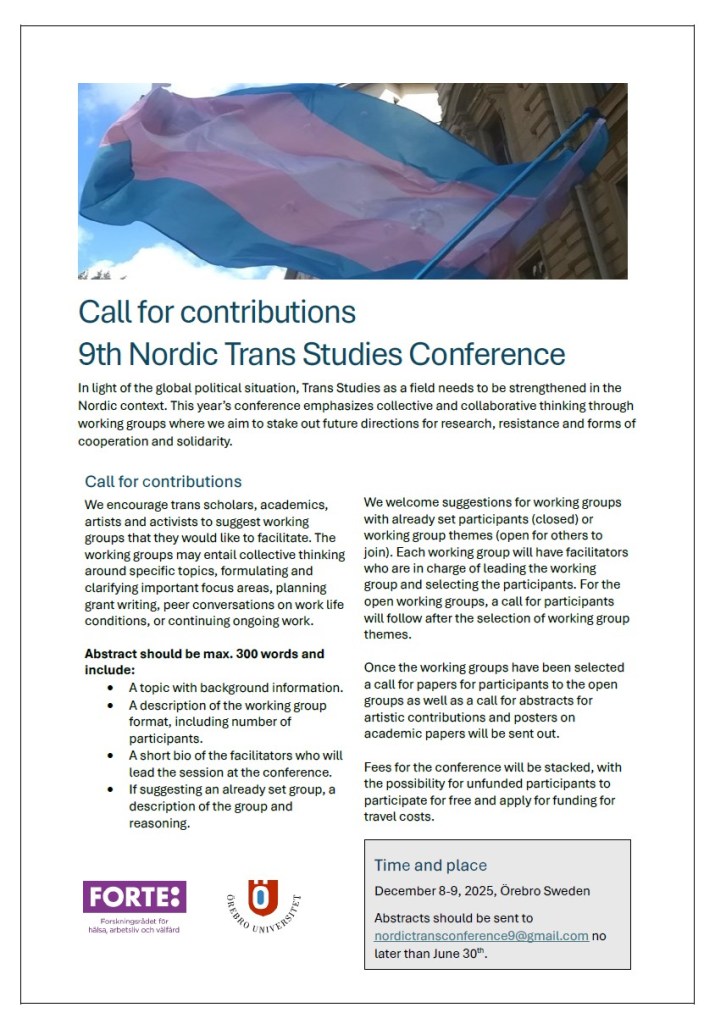 Matilda Wurm från QueerPsy är i år med och anordnar den nionde upplagan av ”Nordic Trans Studies Conference” i Örebro i 8-9 december. Till konferensen efterlyses nu bidrag (se information nedan). Deadline för inskick av förslag på bidrag är den 30 juni och skickas till: nordictransconference9@gmail.com